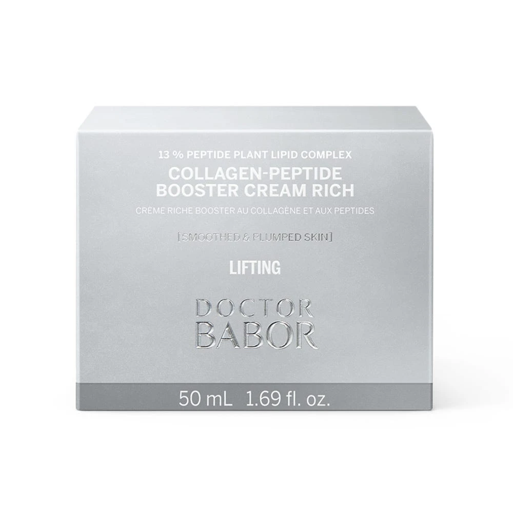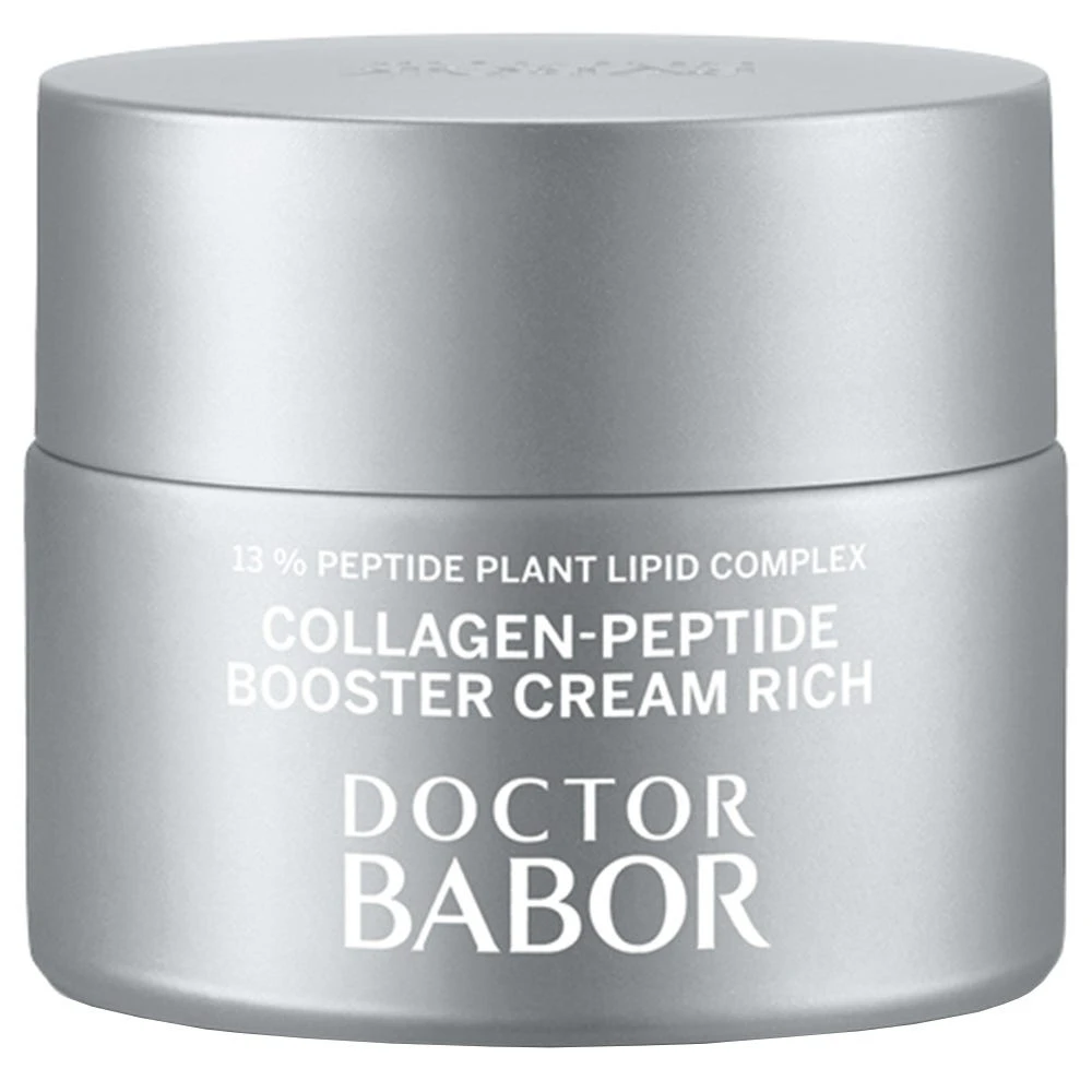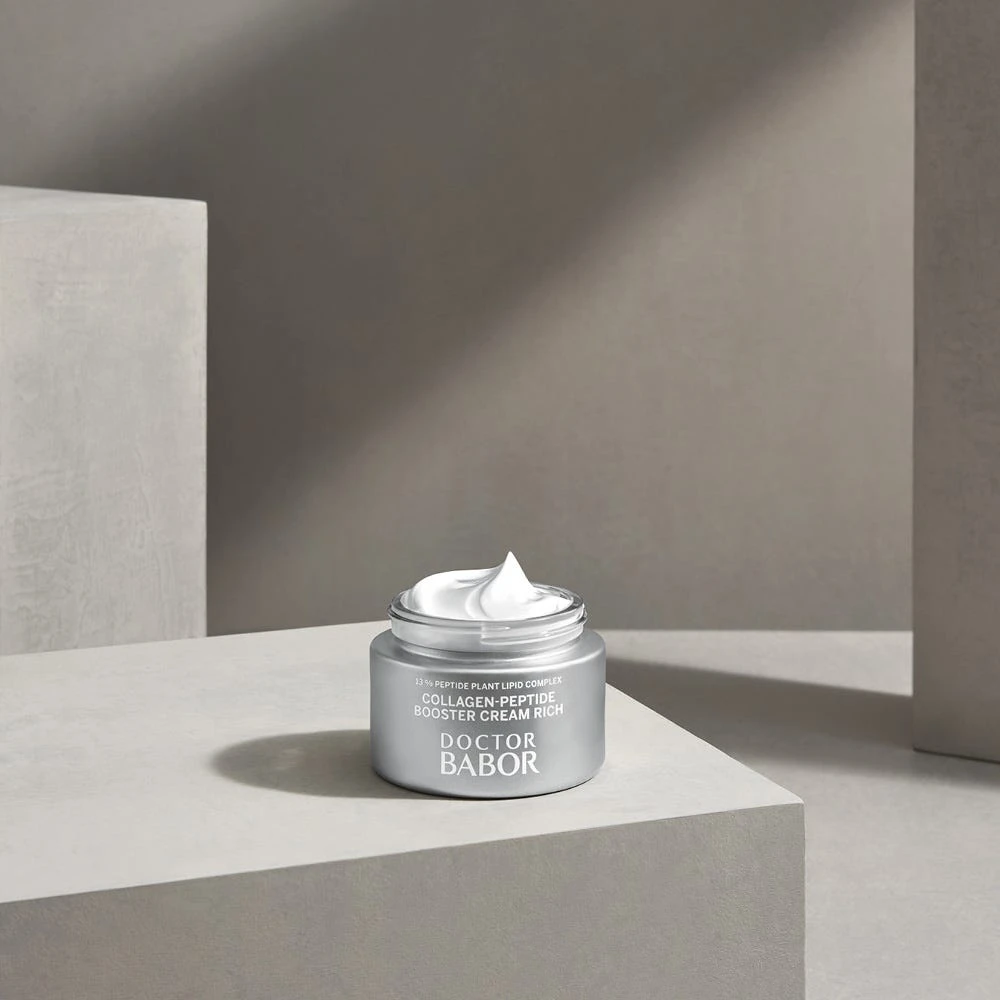 Die BABOR Collagen Peptide Booster Cream rich garantiert eine nachweisliche Reduktion von Faltentiefe und Unterstützung der hauteigenen Kollagenproduktion durch die Kombination hochwirksamer Peptide. Die Elastizität der Haut wird somit verbessert sowie Konturverlust und nachlassende Gewebefestigkeit gemildert. 5% Squalane und Jojobaöl bewahren die Feuchtigkeit und glätten kleine Fältchen. Mit nährender Shea Butter.