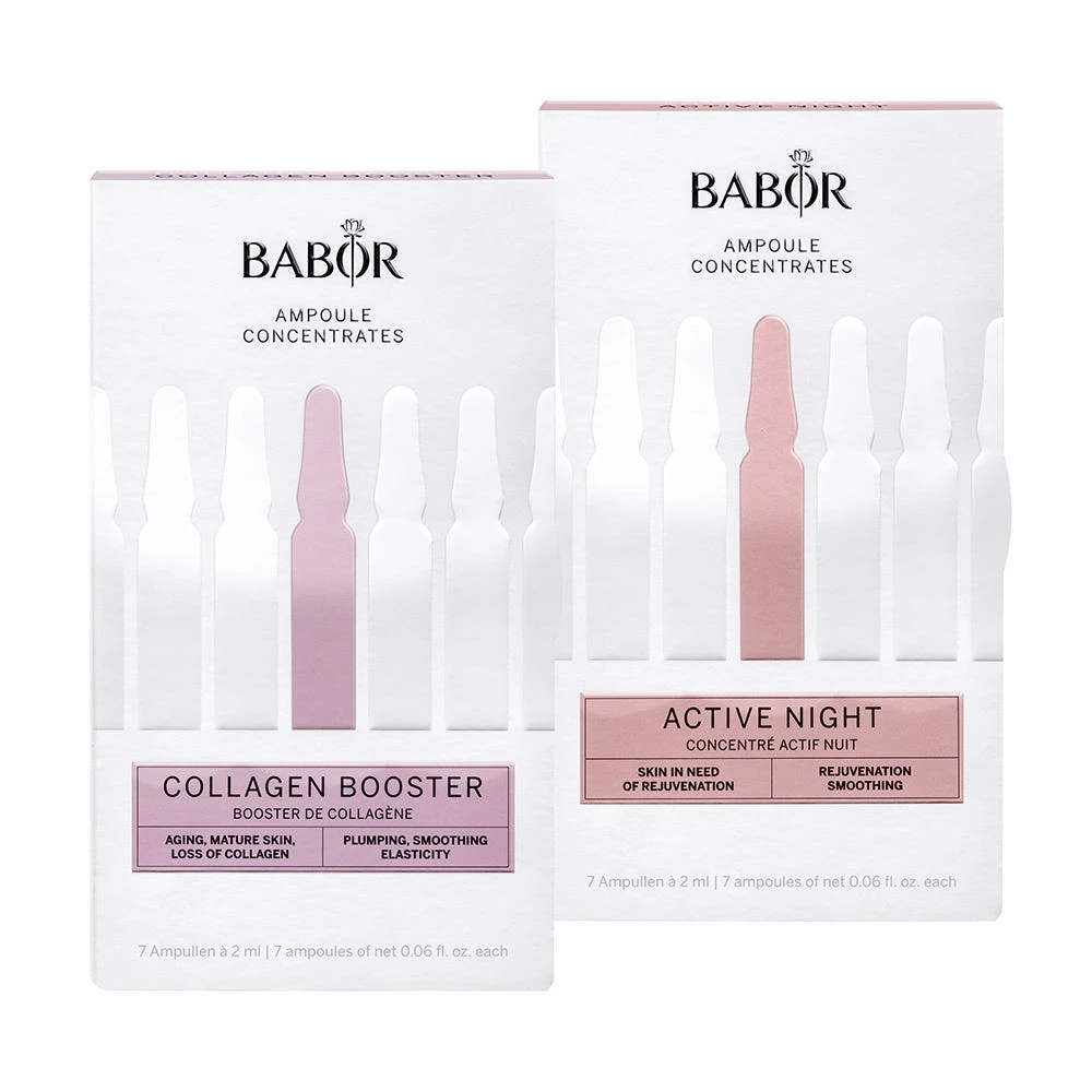 Das BABOR Day & Night Anti-Aging Bundle ist die Routine für reife Haut und sorgt Tag und Nacht für mehr Elastizität und Regeneration der Haut. Das Bundle enthält ein BABOR Ampoule Concentrates Collagen Booster 7×2 ml und ein BABOR Ampoule Concentrates Active Night 7×2 ml.
