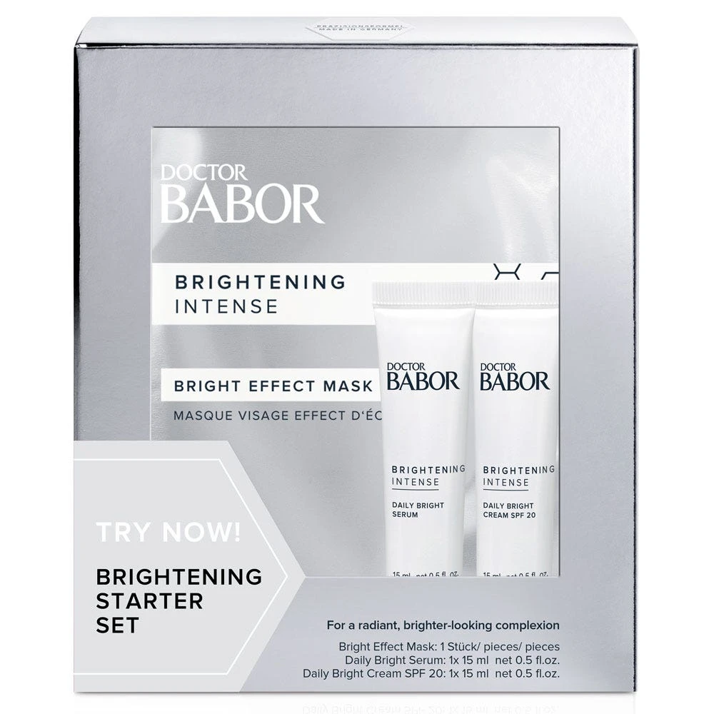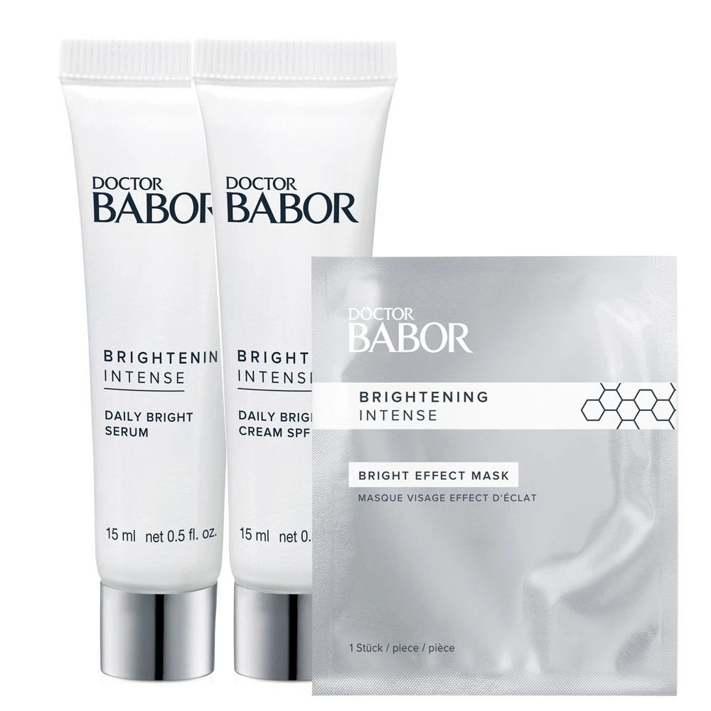 Das BABOR Doctor Babor Brightening Intense Try Me Kit ist das perfekte Starter Set für eine aufhellende Pflegeroutine. Die Produkte sind für alle Hauttypen geeignet und schenken einen strahlenden Teint. Das BABOR Doctor Babor Brightening Intense Try Me Kit enthält die BABOR Doctor Babor Brightening Intense Daily Bright Cream SPF 20 15 ml, das BABOR Doctor Babor Brightening Intense Daily Bright Serum 15 ml und die BABOR Doctor Babor Bright Effect Mask 1 Stk.