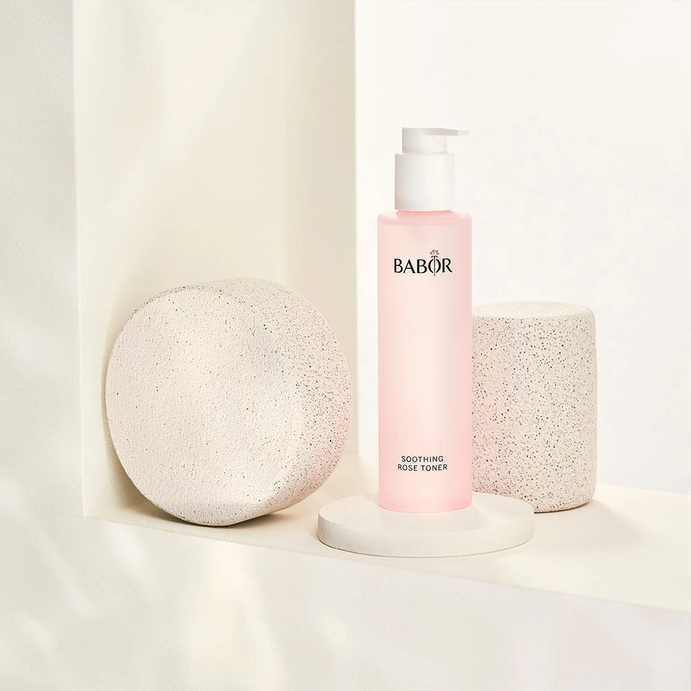 Der BABOR Soothing Rose Toner ist ein tonisierendes Gesichtswasser ohne Alkohol für alle Hauttypen, selbst für die empfindliche Haut. Die milde Formel mit verwöhnendem Rosenduft erfrischt und unterstützt ein ausgeglichenes Mikrobiom. Provitamin B5 unterstützt die Hautberuhigung und Glycerin spendet Feuchtigkeit. Ein Extrakt aus der Damask Rose unterstützt den Schutz der Haut vor Stress, während ein Proteinextrakt aus dem Moringa Samen die Haut vor negativen urbanen Umwelteinflüssen schützt. Perfekt gereinigt zeigt sich die Haut aufnahmefähiger für die nachfolgende Pflege.